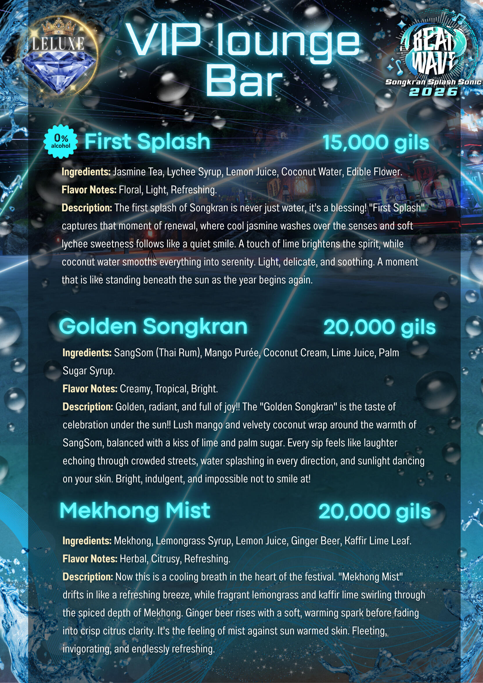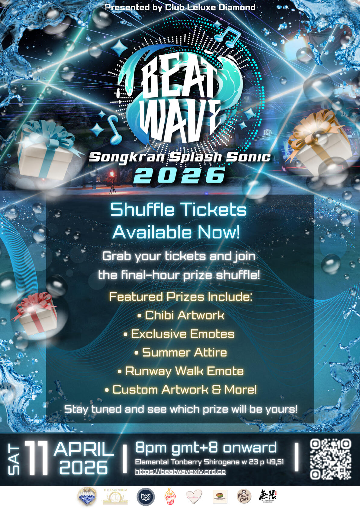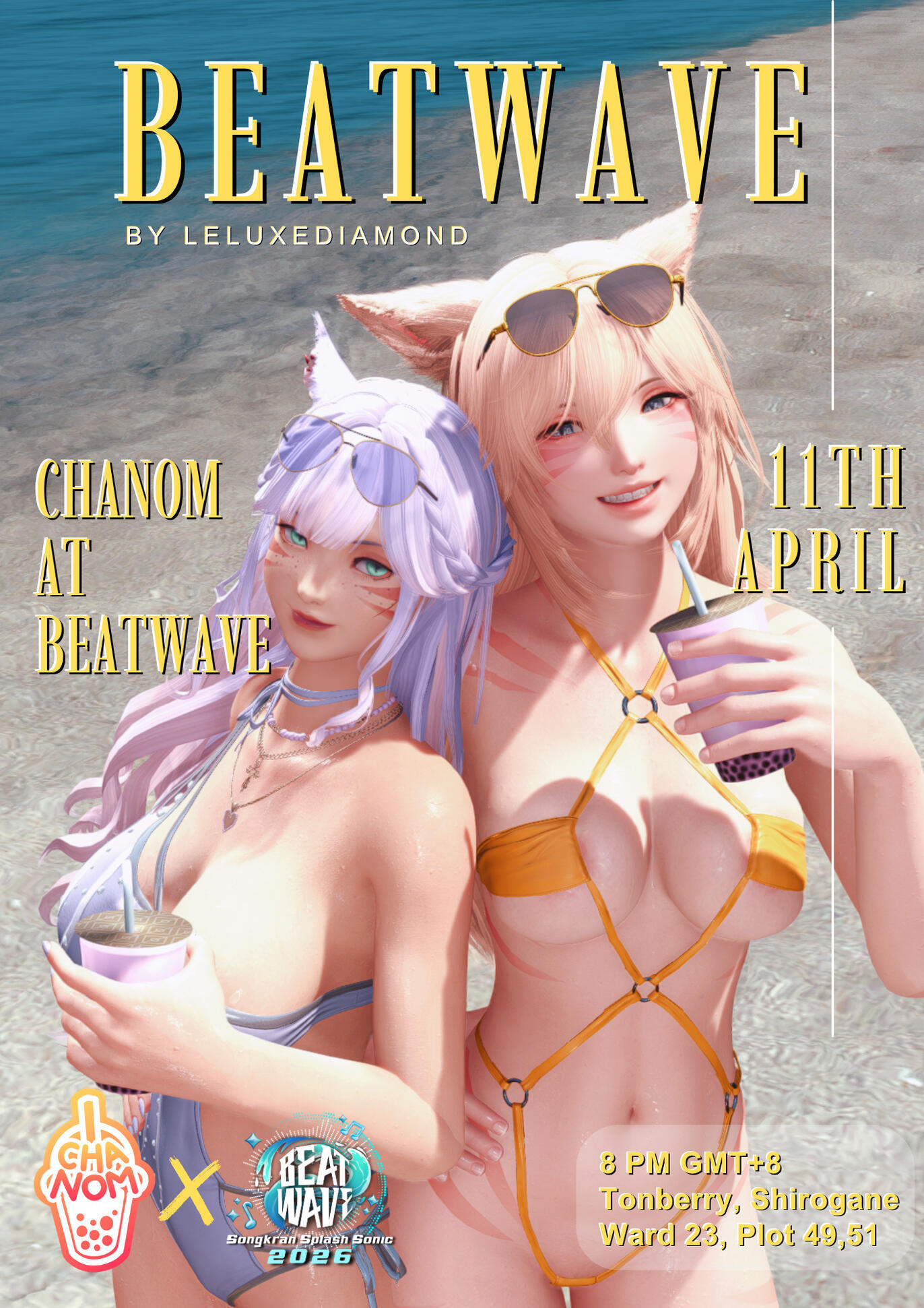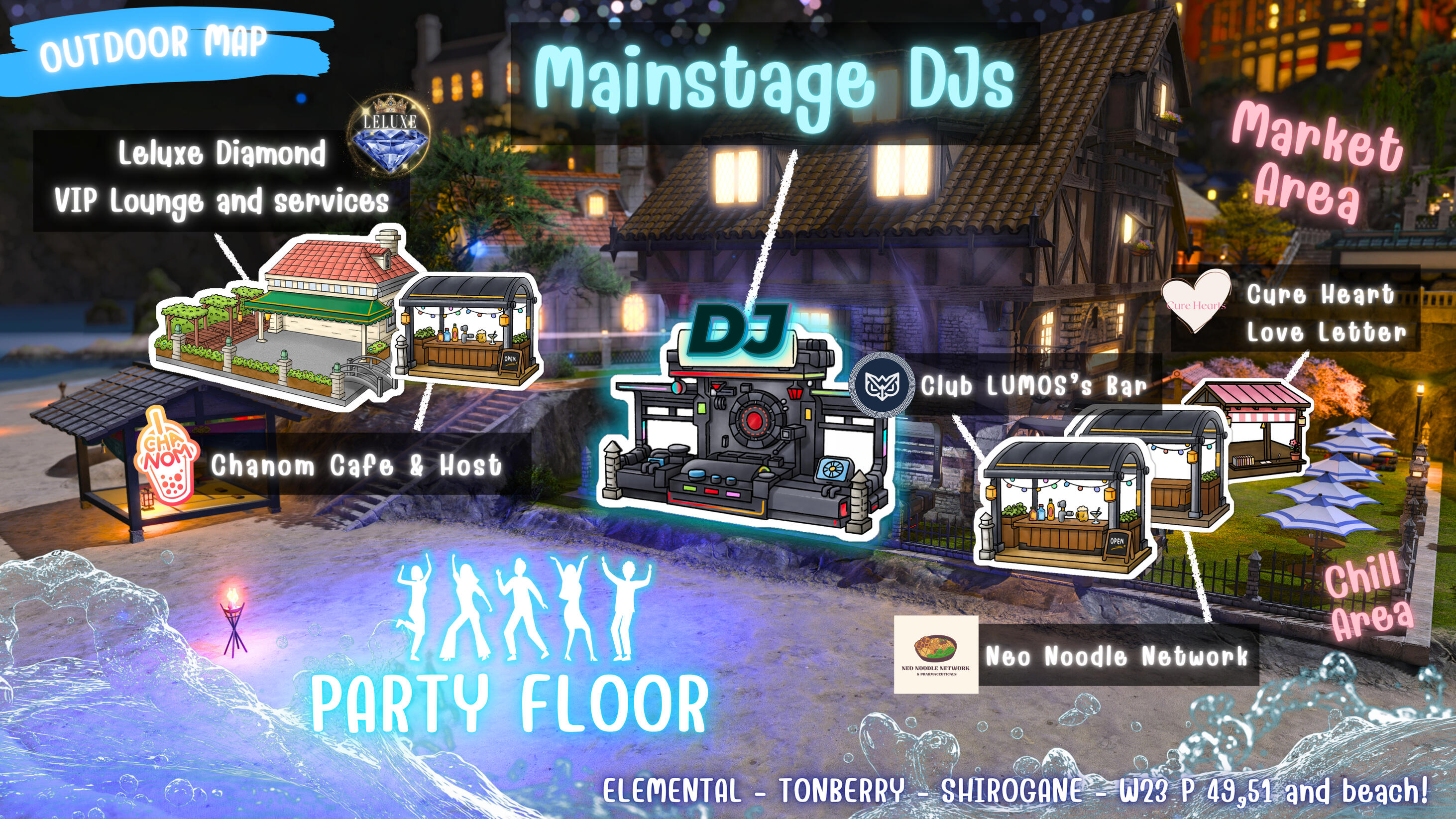 Event Details- Location: Elemental Tonberry, Shirogane Ward 23, Plot 48 & 49- Event Time: 8:00 PM – 12:00 AM (GMT+8)- This will be a Songkran-themed party, similar to a concert-style event with live DJs